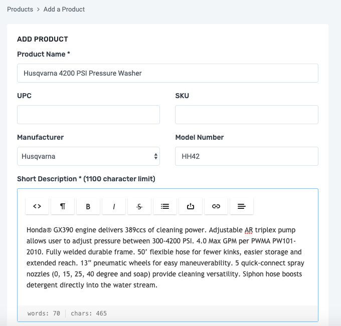 - Fill in the fields with the data you have available. The required fieldsare the product name and the short description. You'll see those fields have the * next to them. We encourage you to also add the model number and manufacturer if available.