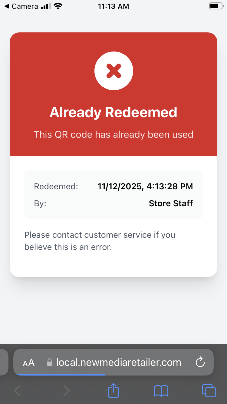 If the coupon has already been redeemed, the cashier will see this error after scanning the QR code-